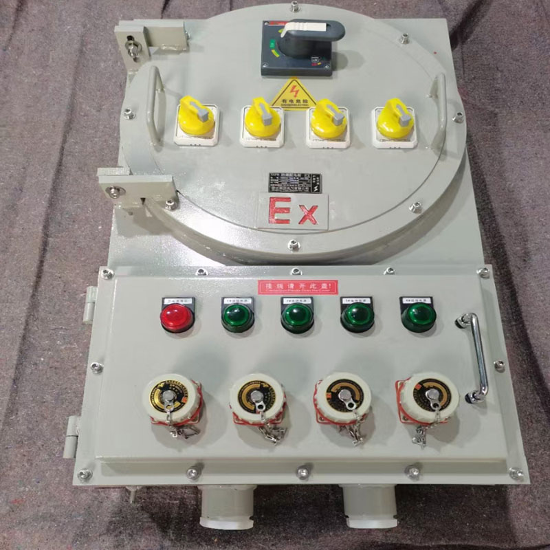 3、防爆控制箱一般有增安型型和隔爆型兩種結構。外殼采用增安型箱體,內裝元件采用隔爆型元件或增安型的元件;外殼采用ZL102鋁合金壓鑄成型,表面高壓靜電噴塑,內裝的元件有按鈕,控制開關,儀表等均為防爆元件。